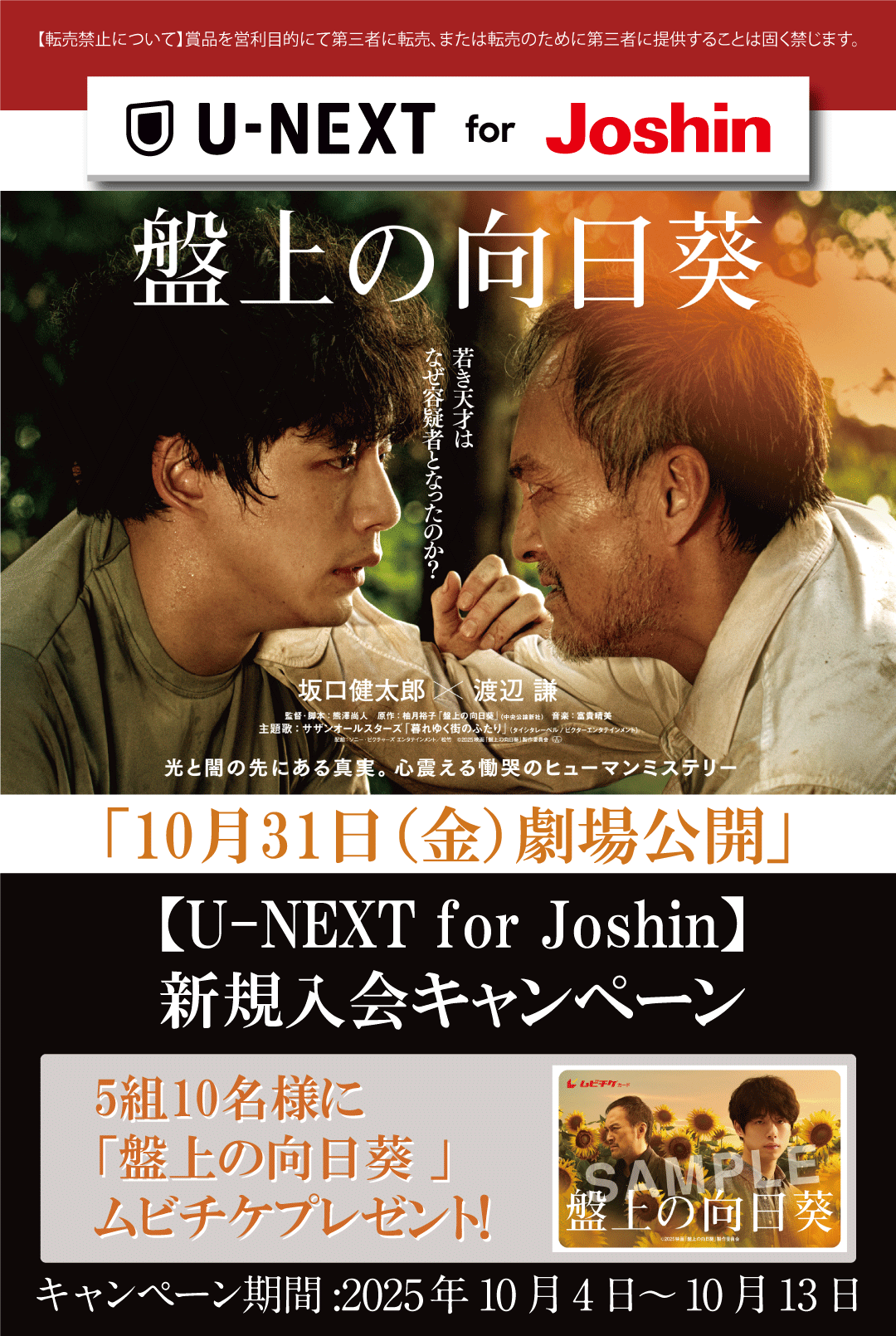 期間中にジョーシンアプリのマイページからキャンペーンにエントリーいただき、ジョーシングループ各店でジョーシンカードまたはデジタル会員証をご提示の上、動画配信サービス「U-NEXT for Joshin」にお申し込みいただいた方の中から抽選で、5組10名様に「盤上の向日葵」のムビチケをプレゼントいたします!