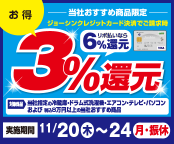 キャンペーン期間中にジョーシン各店にて、当社指定の冷蔵庫・ドラム式洗濯機・エアコン・テレビ・パソコン、および単品税込8万円以上の当社おすすめ商品をジョーシンクレジットカードでお支払いされた場合に限り、対象となります。翌月一括払い・ボーナス1回払い・ボーナス2回払い・長期低金利分割払いの場合はご利用代金のご請求時に『3%』還元、リボ払いの場合はご利用代金のご請求時に『6%』還元とさせていただきます。