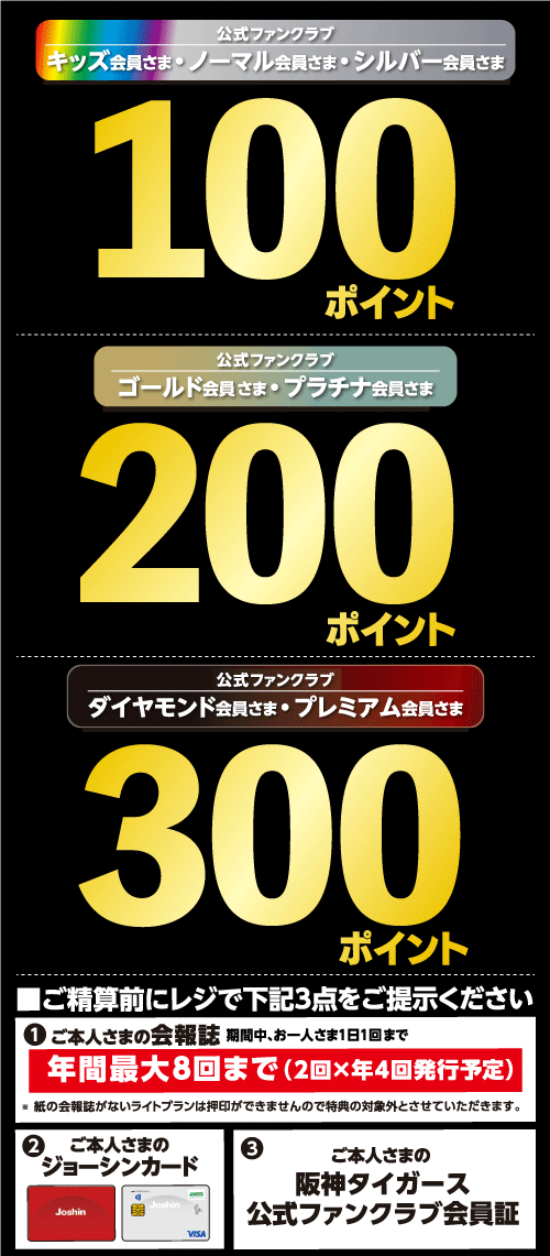●ご精算前に、レジで「ご本人さまの阪神タイガース公式ファンクラブ会報誌」「ご本人さまの阪神タイガース公式ファンクラブ会員証」「ご本人さまのジョーシンカード」をご提示ください。ご精算後は無効です。